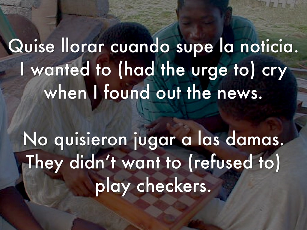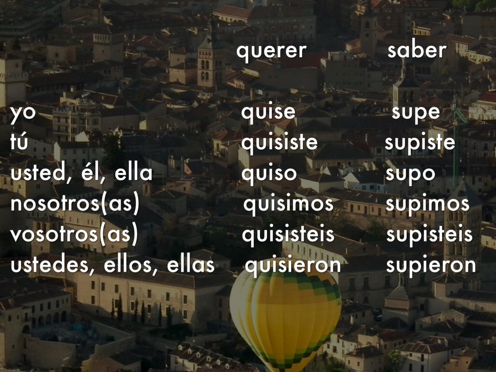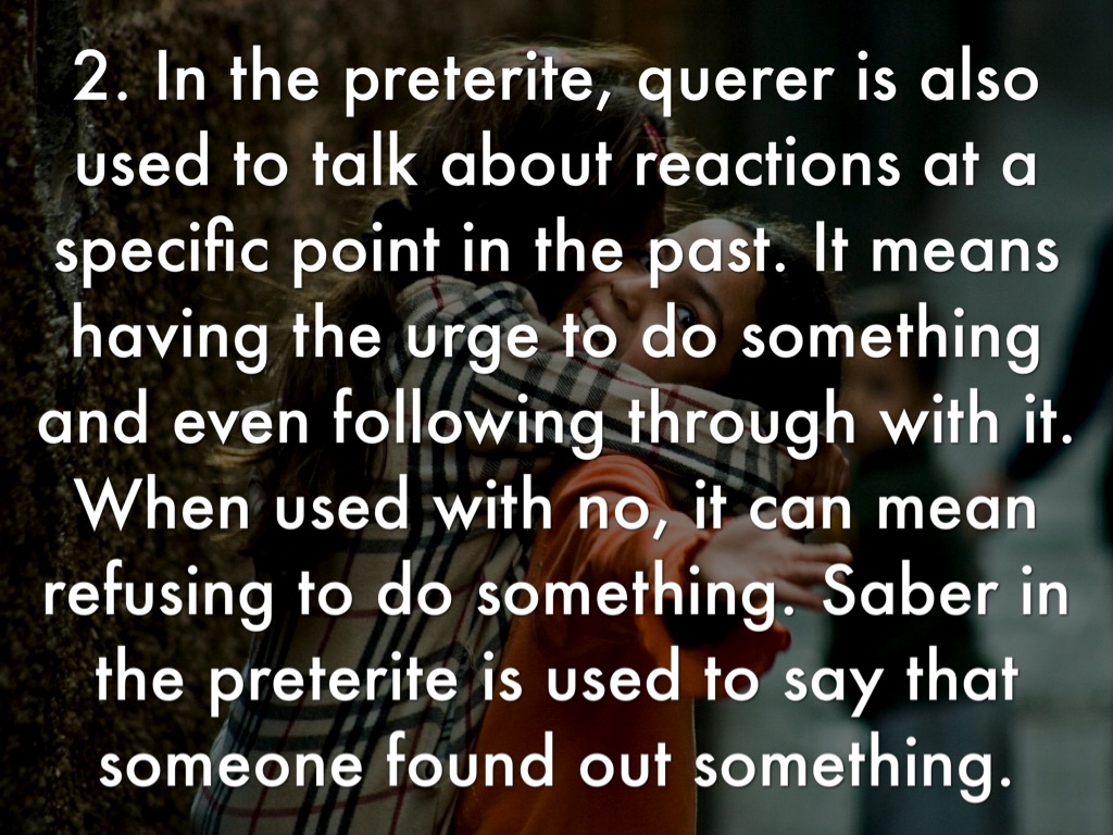 2. In the preterite, querer is also used to talk about reactions at a specific point in the past. It means having the urge to do something and even following through with it. When used with no, it can mean refusing to do something. Saber in the preterite is used to say that someone found out something.