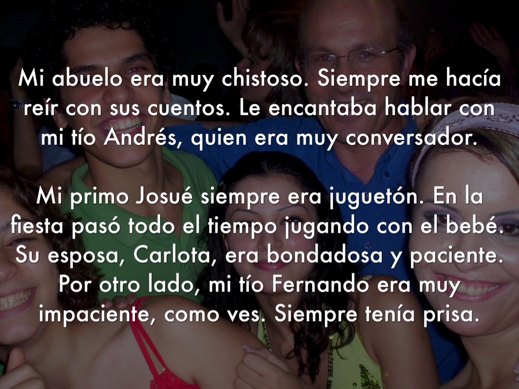 Mi primo Josué siempre era juguetón. En la fiesta pasó todo el tiempo jugando con el bebé. Su esposa, Carlota, era bondadosa y paciente. Por otro lado, mi tío Fernando era muy impaciente, como ves. Siempre tenía prisa.