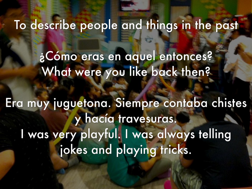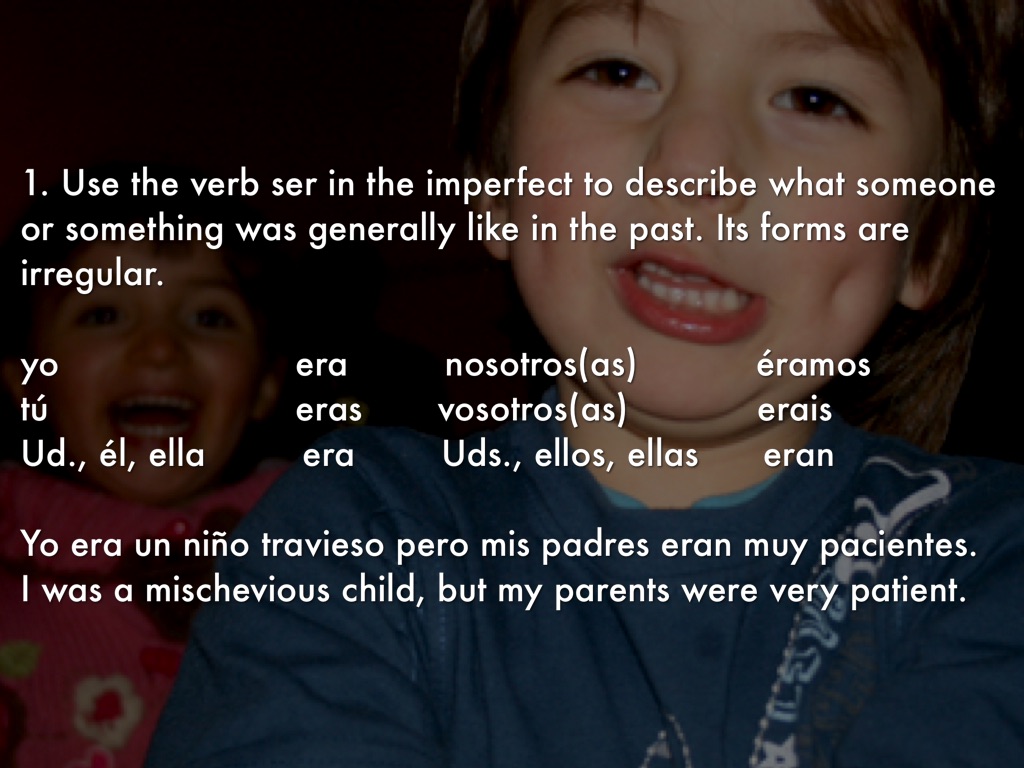 1. Use the verb ser in the imperfect to describe what someone or something was generally like in the past. Its forms are irregular.