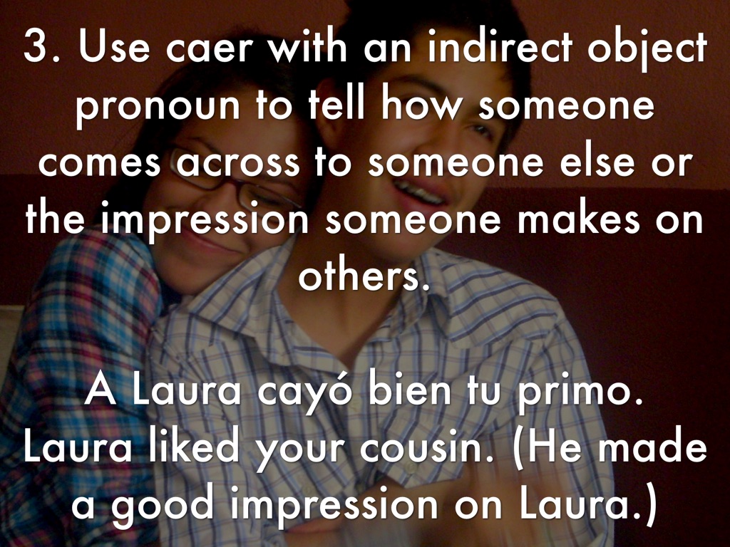 3. Use caer with an indirect object pronoun to tell how someone comes across to someone else or the impression someone makes on others.