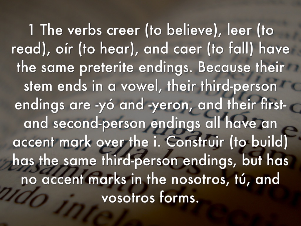 1 The verbs creer (to believe), leer (to read), oír (to hear), and caer (to fall) have the same preterite endings. Because their stem ends in a vowel, their third-person endings are -yó and -yeron, and their first- and second-person endings all have an accent mark over the i. Construir (to build) has the same third-person endings, but has no accent marks in the nosotros, tú, and vosotros forms.