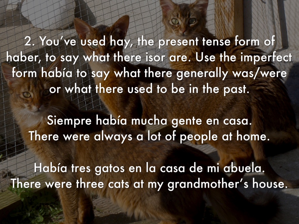 2. You’ve used hay, the present tense form of haber, to say what there isor are. Use the imperfect form había to say what there generally was/were or what there used to be in the past.