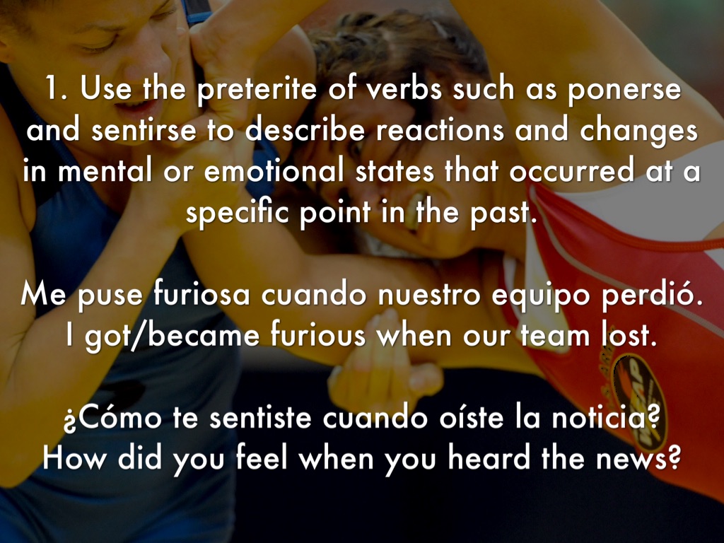 1. Use the preterite of verbs such as ponerse and sentirse to describe reactions and changes in mental or emotional states that occurred at a specific point in the past.