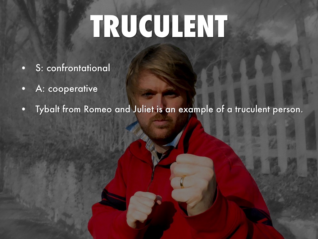 Tybalt from Romeo and Juliet is an example of a truculent person.