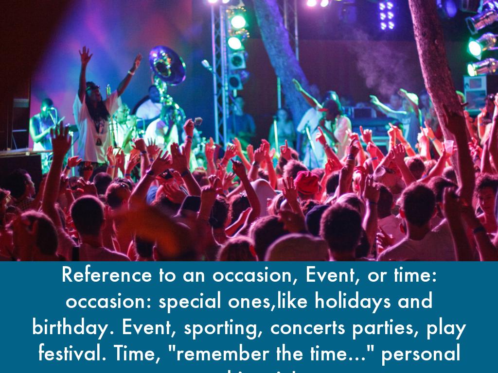 Reference to an occasion, Event, or time: occasion: special ones,like holidays and birthday. Event, sporting, concerts parties, play festival. Time, "remember the time..." personal or historic!