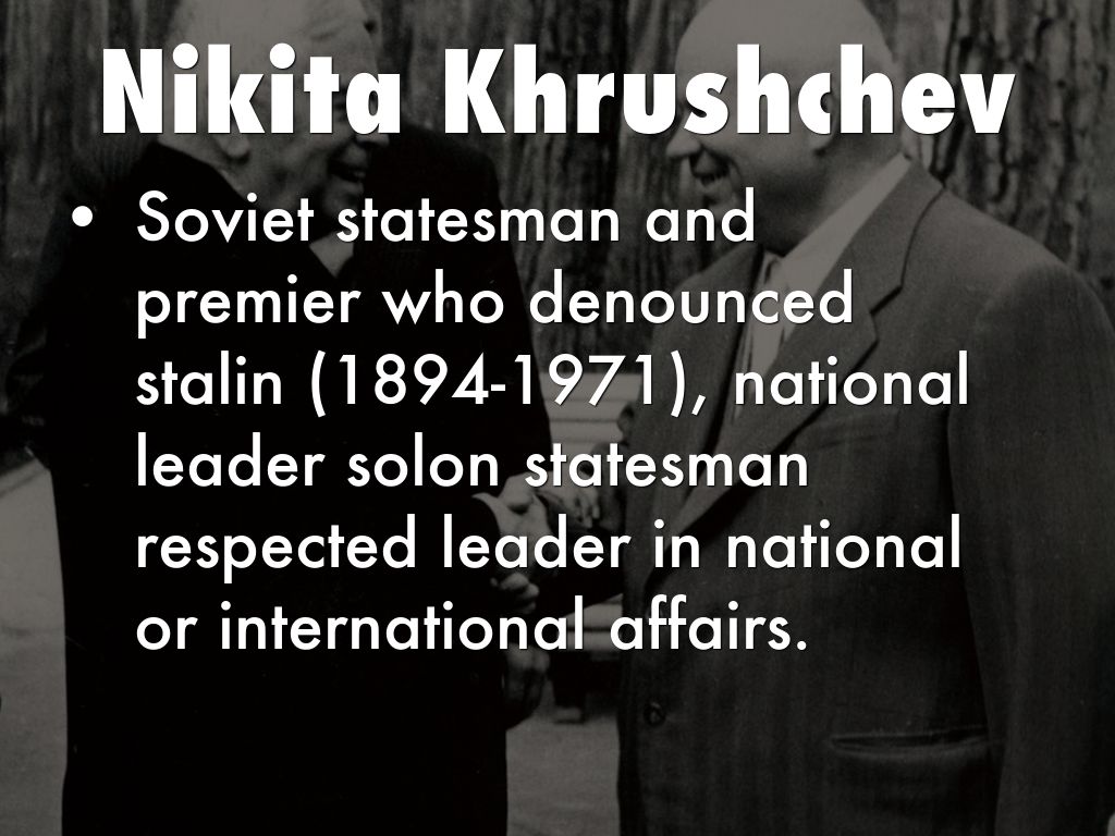 • Soviet statesman and premier who denounced stalin (1894-1971), national leader solon statesman respected leader in national or international affairs.