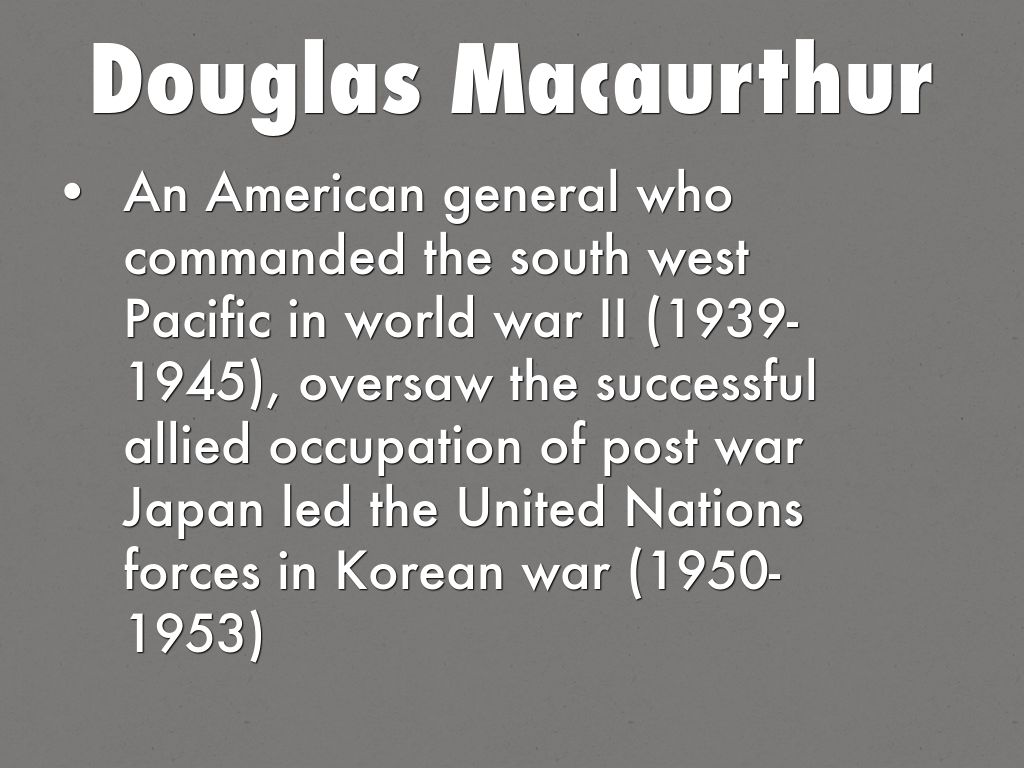• An American general who commanded the south west Pacific in world war II (1939-1945), oversaw the successful allied occupation of post war Japan led the United Nations forces in Korean war (1950-1953)