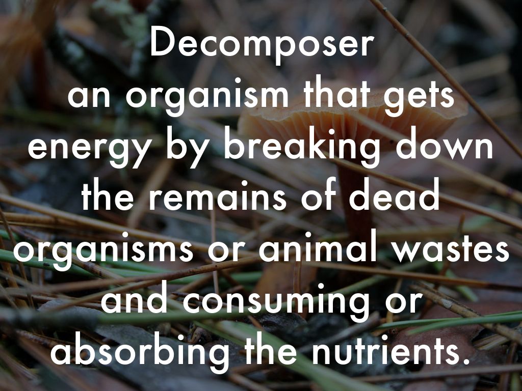 an organism that gets energy by breaking down the remains of dead organisms or animal wastes and consuming or absorbing the nutrients.