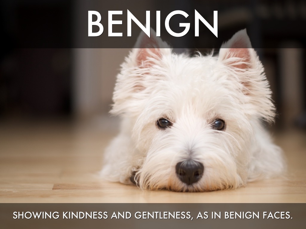 SHOWING KINDNESS AND GENTLENESS, AS IN BENIGN FACES.