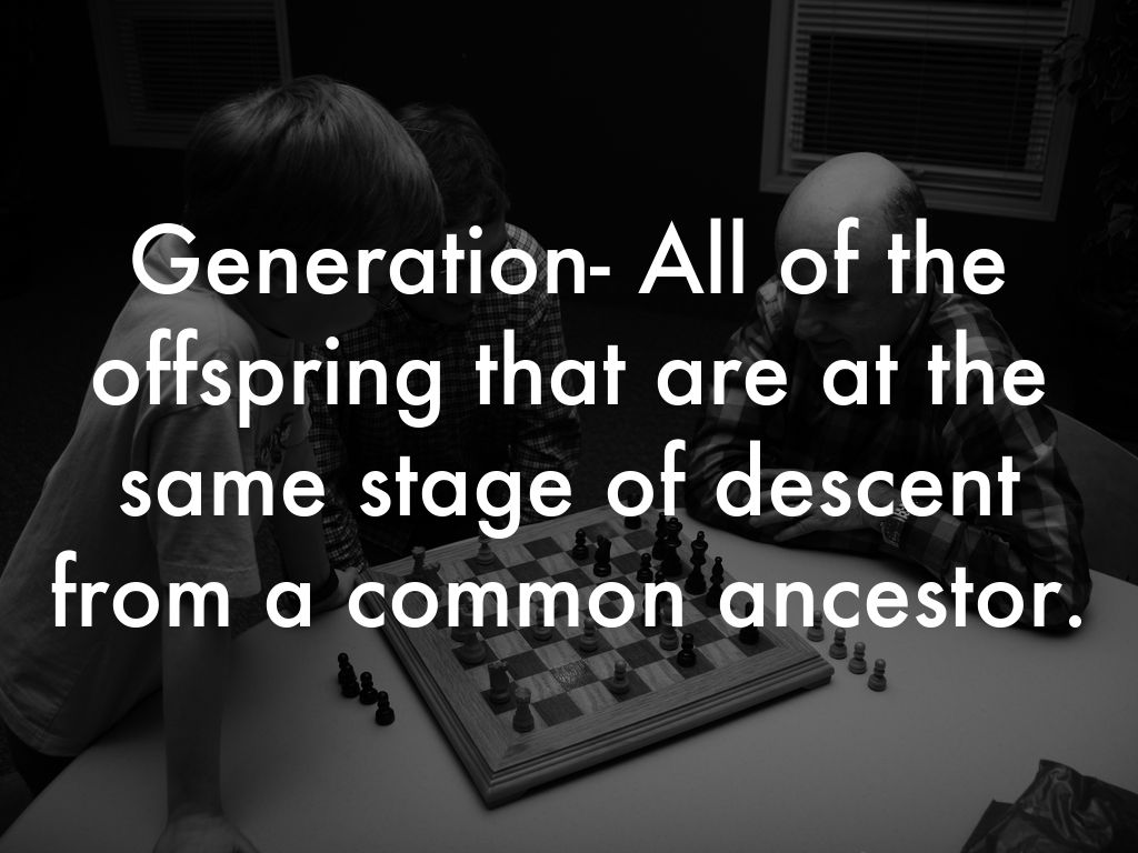 Generation- All of the offspring that are at the same stage of descent from a common ancestor.