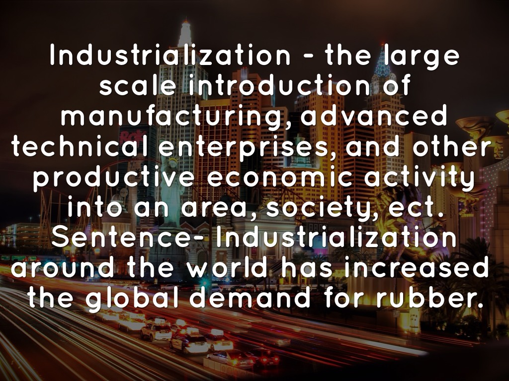 Industrialization - the large scale introduction of manufacturing, advanced technical enterprises, and other productive economic activity into an area, society, ect. Sentence- Industrialization around the world has increased the global demand for rubber.