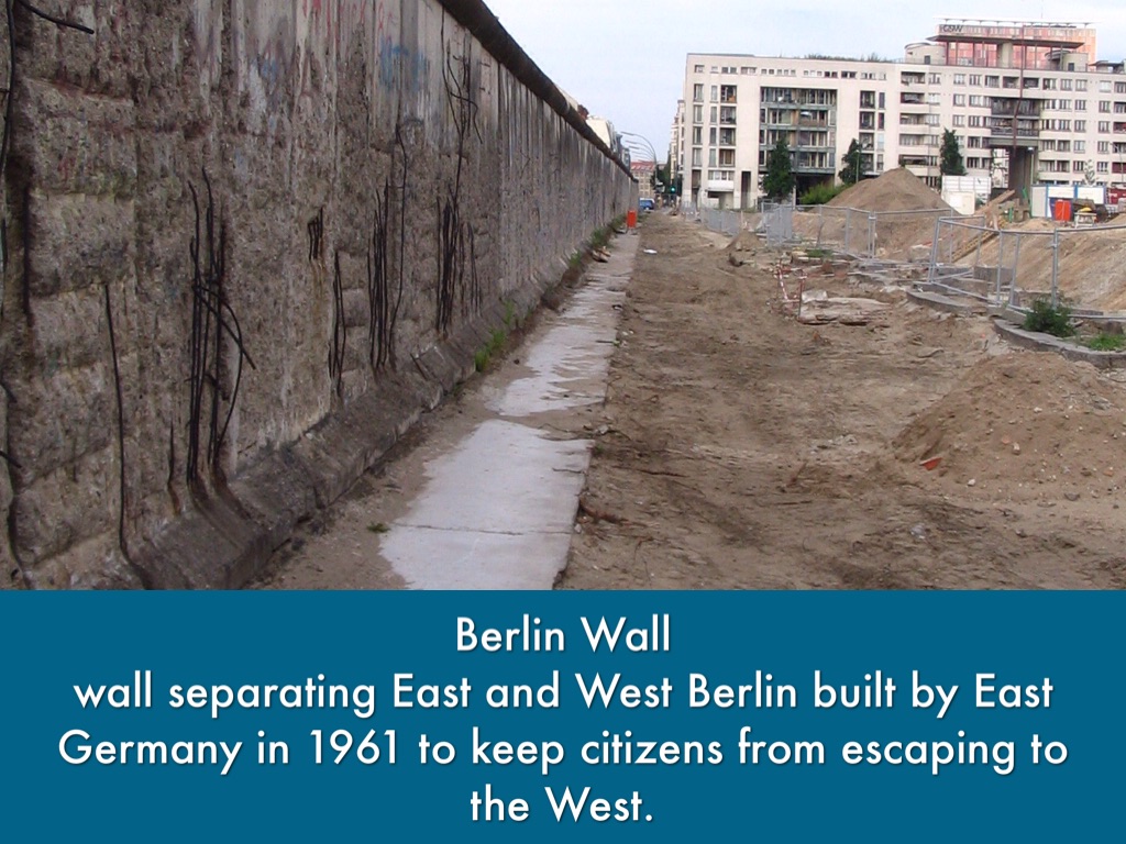 wall separating East and West Berlin built by East Germany in 1961 to keep citizens from escaping to the West.
