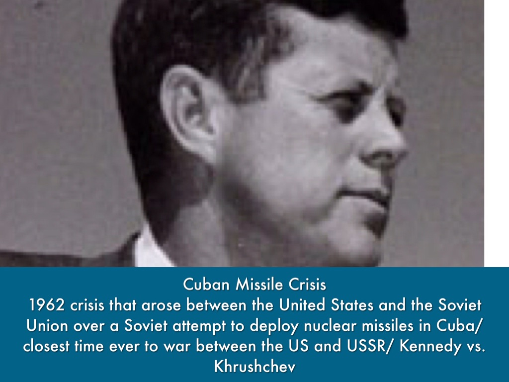 1962 crisis that arose between the United States and the Soviet Union over a Soviet attempt to deploy nuclear missiles in Cuba/ closest time ever to war between the US and USSR/ Kennedy vs. Khrushchev