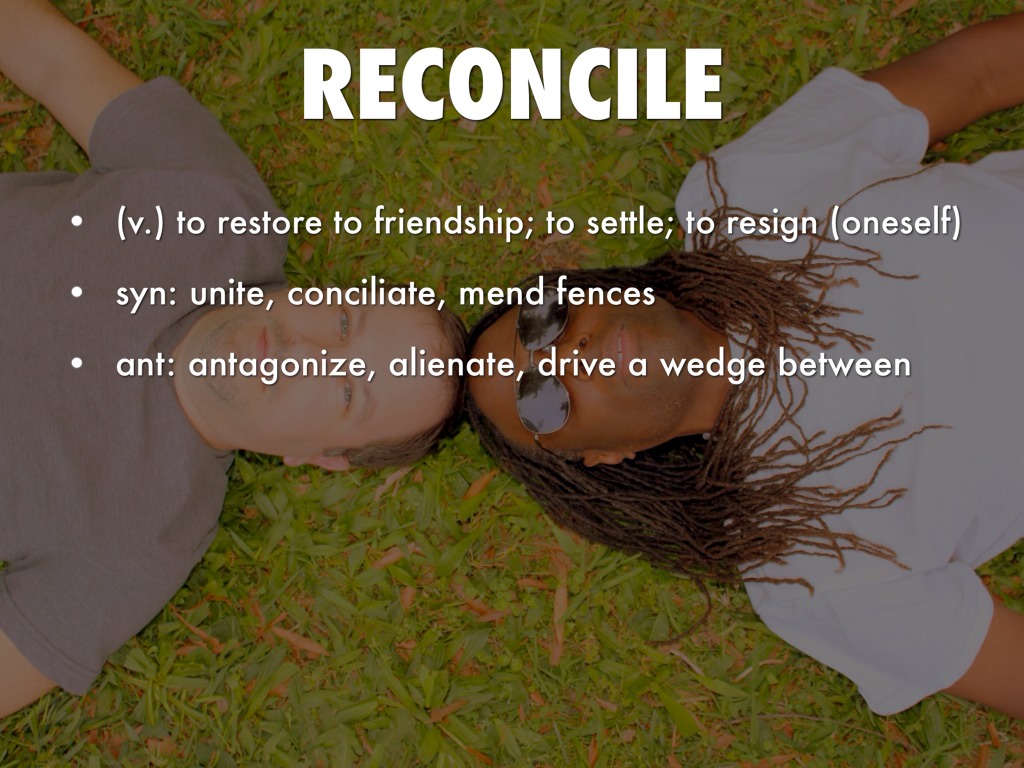 (v.) to restore to friendship; to settle; to resign (oneself)