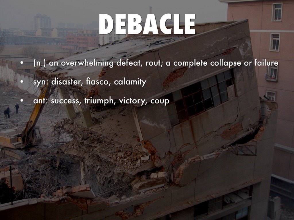 (n.) an overwhelming defeat, rout; a complete collapse or failure