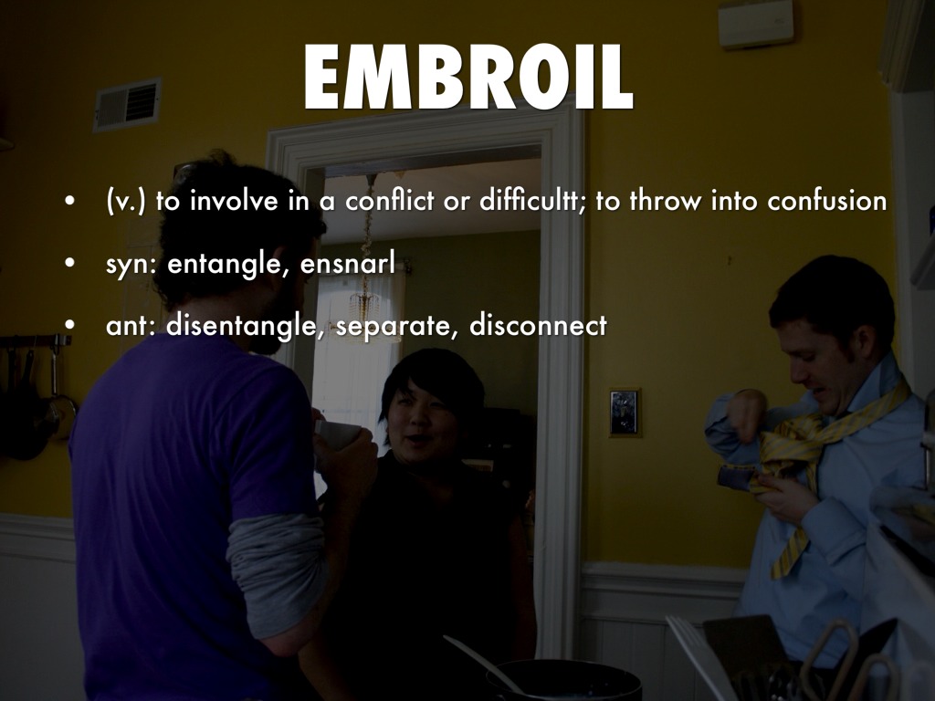 (v.) to involve in a conflict or difficultt; to throw into confusion