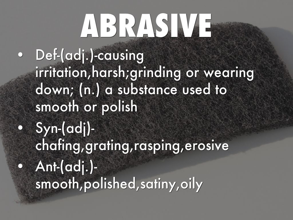 Def-(adj.)-causing irritation,harsh;grinding or wearing down; (n.) a substance used to smooth or polish