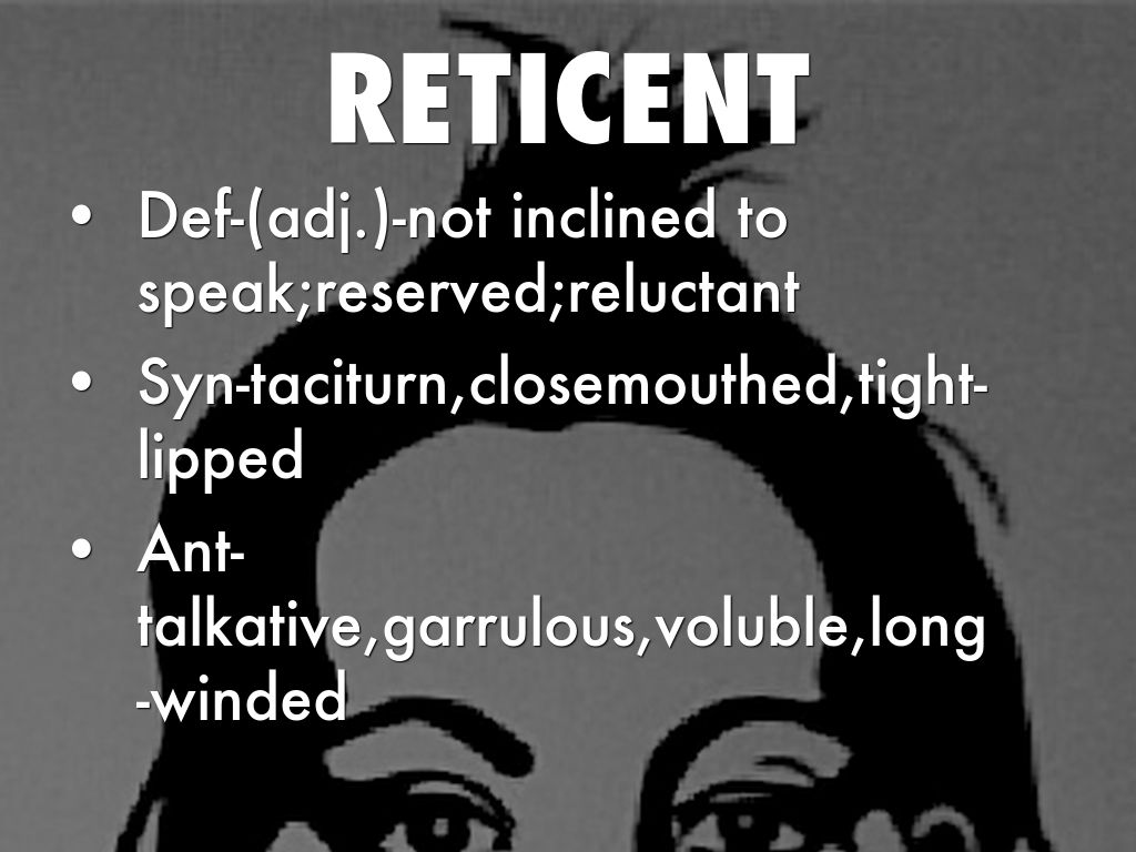 Def-(adj.)-not inclined to speak;reserved;reluctant