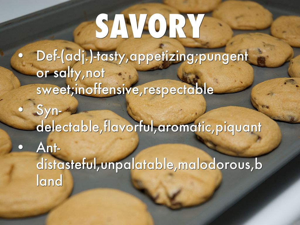 Def-(adj.)-tasty,appetizing;pungent or salty,not sweet;inoffensive,respectable