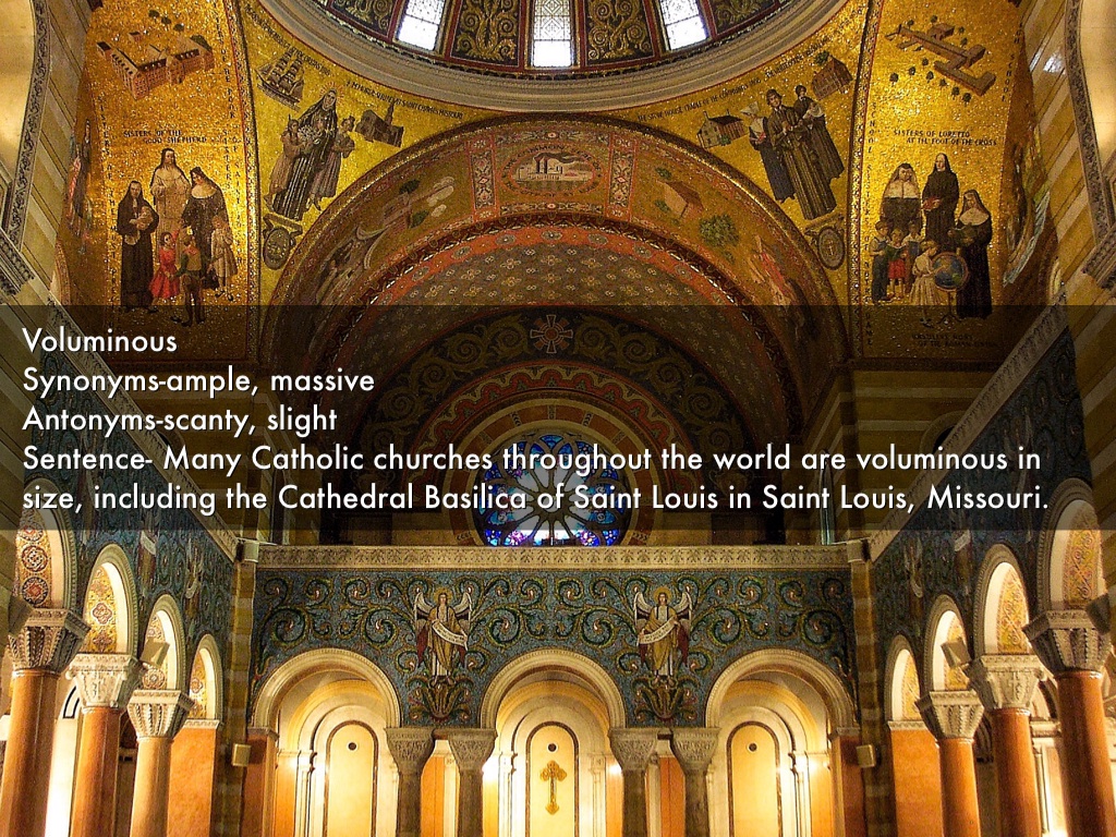 Voluminous Synonyms-ample, massive Antonyms-scanty, slight Sentence- Many Catholic churches throughout the world are voluminous in size, including the Cathedral Basilica of Saint Louis in Saint Louis, Missouri.