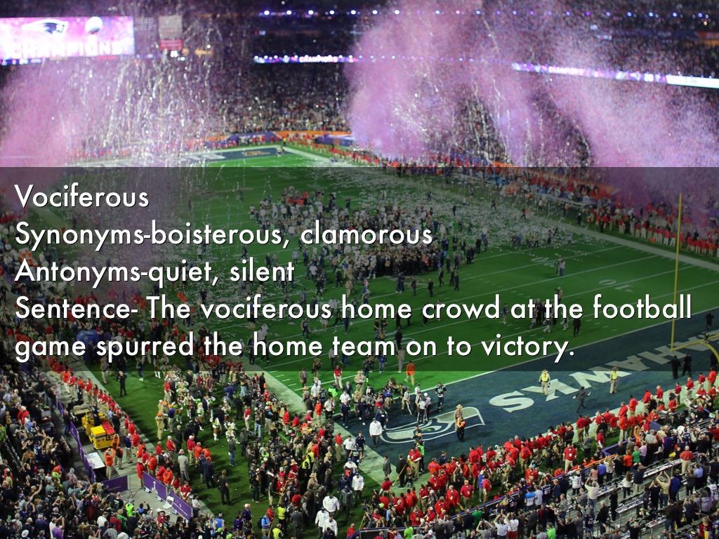 Vociferous Synonyms-boisterous, clamorous Antonyms-quiet, silent Sentence- The vociferous home crowd at the football game spurred the home team on to victory.