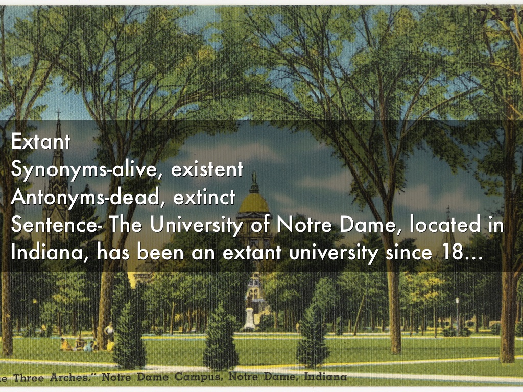Extant Synonyms-alive, existent Antonyms-dead, extinct Sentence- The University of Notre Dame, located in Indiana, has been an extant university since 1842.