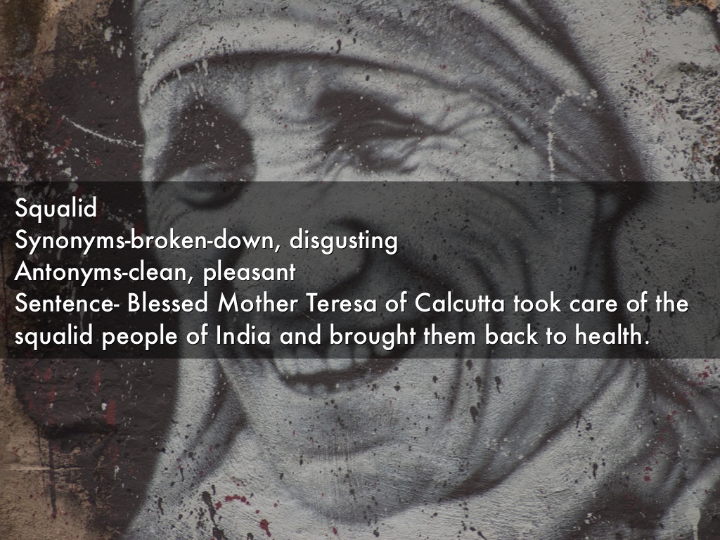 Squalid Synonyms-broken-down, disgusting Antonyms-clean, pleasant Sentence- Blessed Mother Teresa of Calcutta took care of the squalid people of India and brought them back to health.
