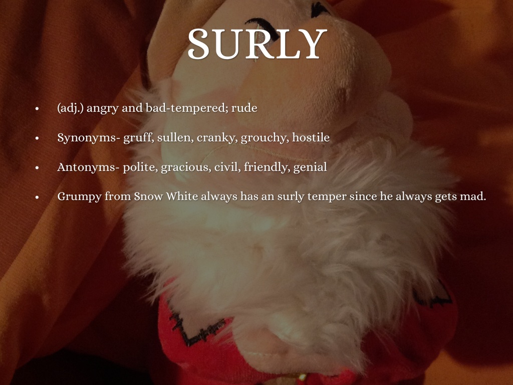 Synonyms- gruff, sullen, cranky, grouchy, hostile