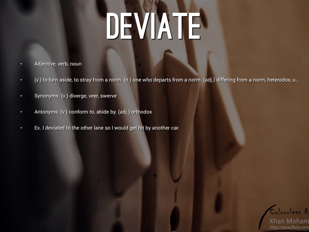 (v.) to turn aside, to stray from a norm. (n.) one who departs from a norm. (adj.) differing from a norm, heterodox, unconvential.