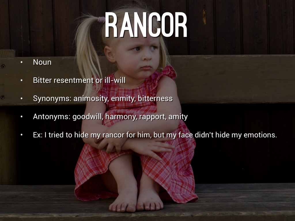Ex: I tried to hide my rancor for him, but my face didn't hide my emotions.