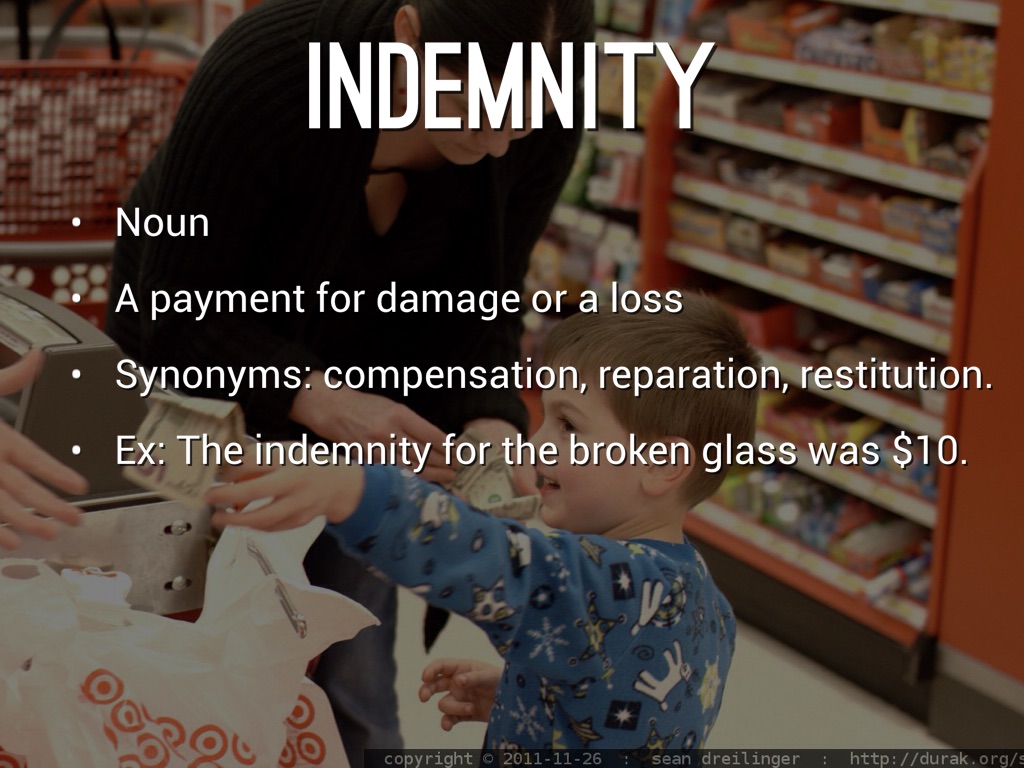 Ex: The indemnity for the broken glass was $10.