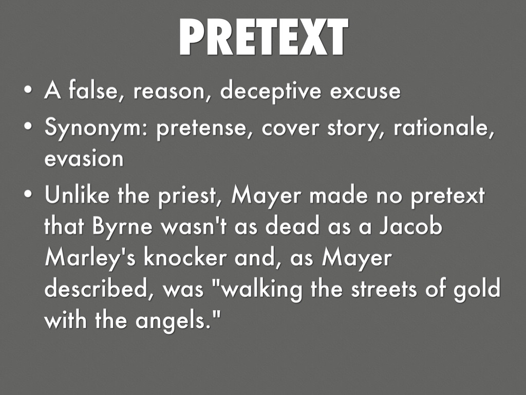 Unlike the priest, Mayer made no pretext that Byrne wasn't as dead as a Jacob Marley's knocker and, as Mayer described, was "walking the streets of gold with the angels."