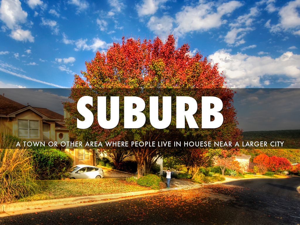 A TOWN OR OTHER AREA WHERE PEOPLE LIVE IN HOUESE NEAR A LARGER CITY