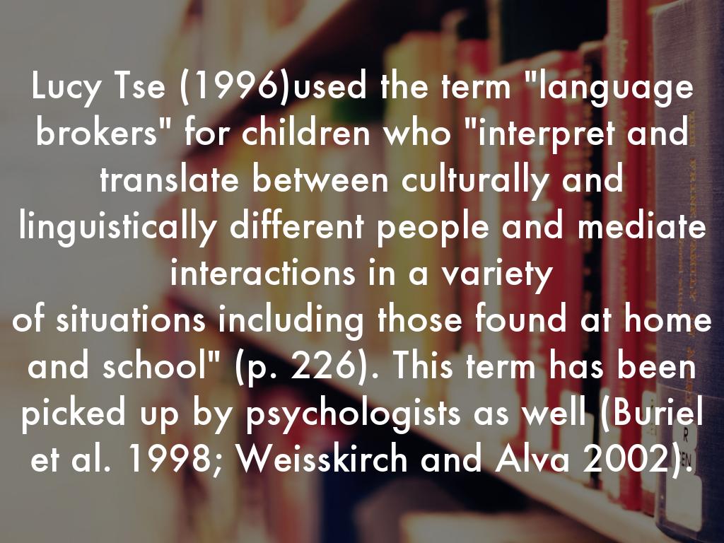 Lucy Tse (1996)used the term "language brokers" for children who "interpret and translate between culturally and linguistically different people and mediate interactions in a variety