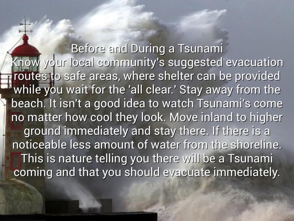 Know your local community's suggested evacuation routes to safe areas, where shelter can be provided while you wait for the 'all clear.' Stay away from the beach. It isn't a good idea to watch Tsunami's come no matter how cool they look. Move inland to higher ground immediately and stay there. If there is a noticeable less amount of water from the shoreline. This is nature telling you there will be a Tsunami coming and that you should evacuate immediately.