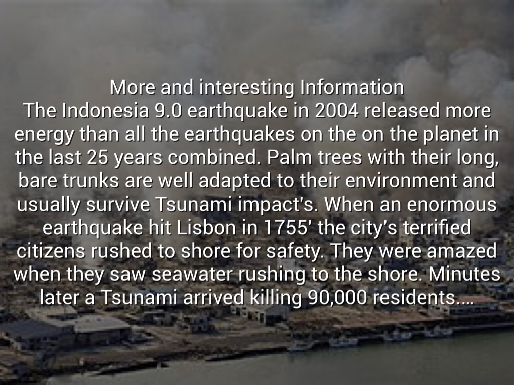 The Indonesia 9.0 earthquake in 2004 released more energy than all the earthquakes on the on the planet in the last 25 years combined. Palm trees with their long, bare trunks are well adapted to their environment and usually survive Tsunami impact's. When an enormous earthquake hit Lisbon in 1755' the city's terrified citizens rushed to shore for safety. They were amazed when they saw seawater rushing to the shore. Minutes later a Tsunami arrived killing 90,000 residents.