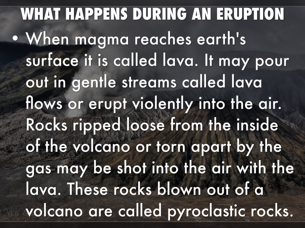 When magma reaches earth's surface it is called lava. It may pour out in gentle streams called lava flows or erupt violently into the air. Rocks ripped loose from the inside of the volcano or torn apart by the gas may be shot into the air with the lava. These rocks blown out of a volcano are called pyroclastic rocks.