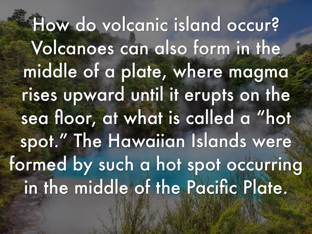 How do volcanic island occur? Volcanoes can also form in the middle of a plate, where magma rises upward until it erupts on the sea floor, at what is called a “hot spot.” The Hawaiian Islands were formed by such a hot spot occurring in the middle of the Pacific Plate.