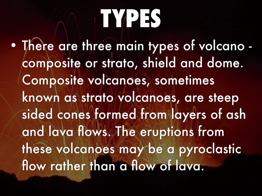 There are three main types of volcano - composite or strato, shield and dome. Composite volcanoes, sometimes known as strato volcanoes, are steep sided cones formed from layers of ash and lava flows. The eruptions from these volcanoes may be a pyroclastic flow rather than a flow of lava.