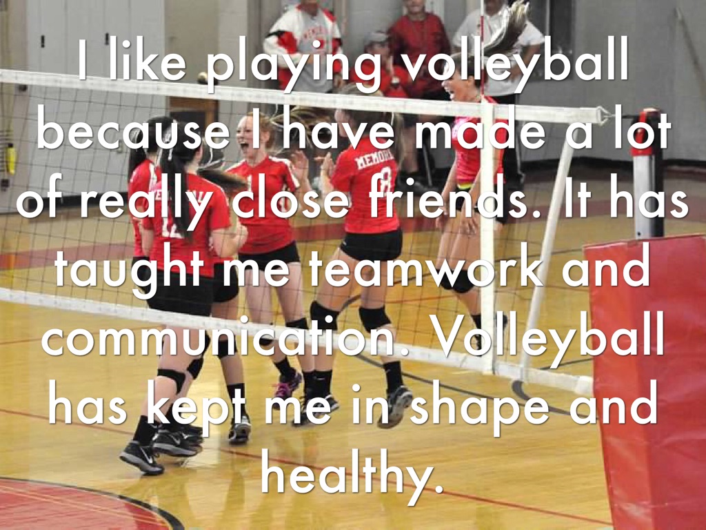 I like playing volleyball because I have made a lot of really close friends. It has taught me teamwork and communication. Volleyball has kept me in shape and healthy.