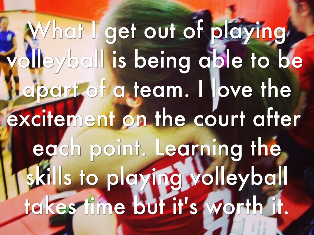 What I get out of playing volleyball is being able to be apart of a team. I love the excitement on the court after each point. Learning the skills to playing volleyball takes time but it's worth it.