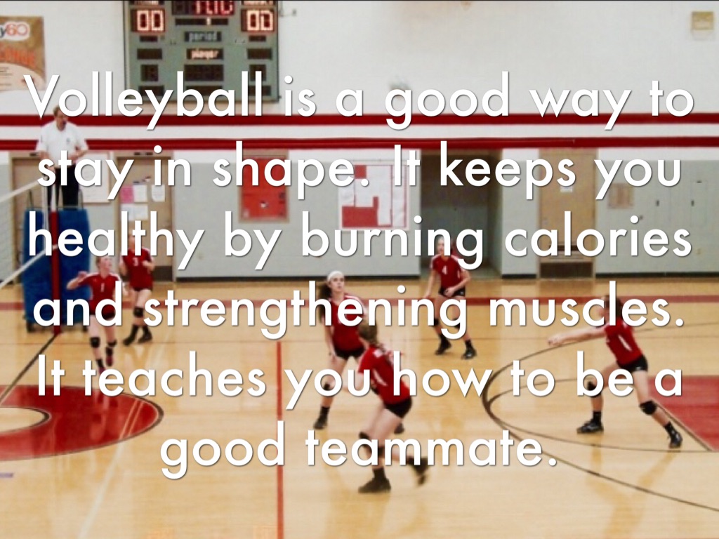 Volleyball is a good way to stay in shape. It keeps you healthy by burning calories and strengthening muscles. It teaches you how to be a good teammate.