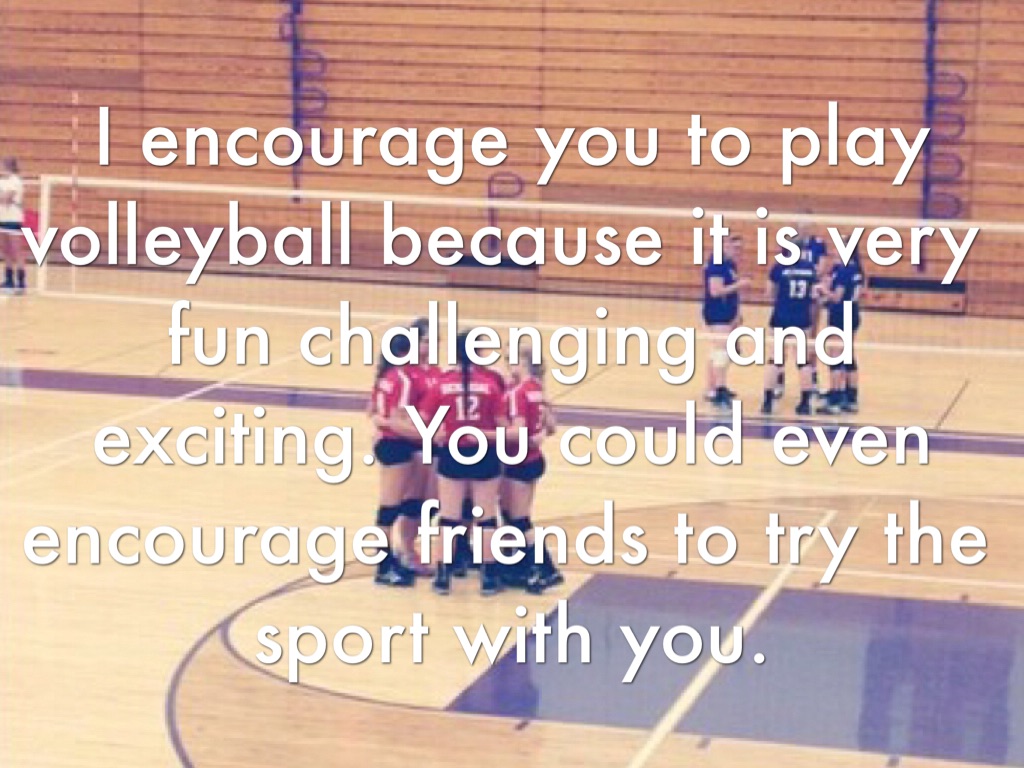 I encourage you to play volleyball because it is very fun challenging and exciting. You could even encourage friends to try the sport with you.