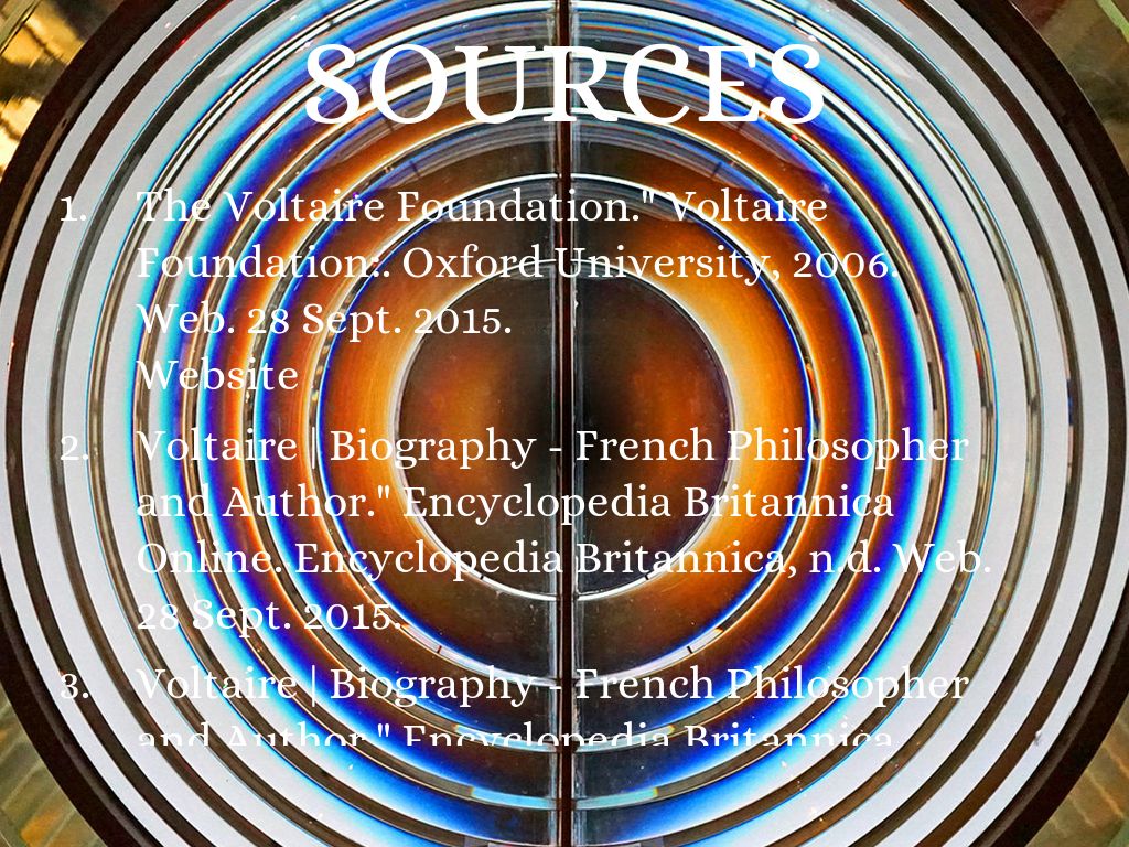 Voltaire | Biography - French Philosopher and Author." Encyclopedia Britannica Online. Encyclopedia Britannica, n.d. Web. 28 Sept. 2015. Website