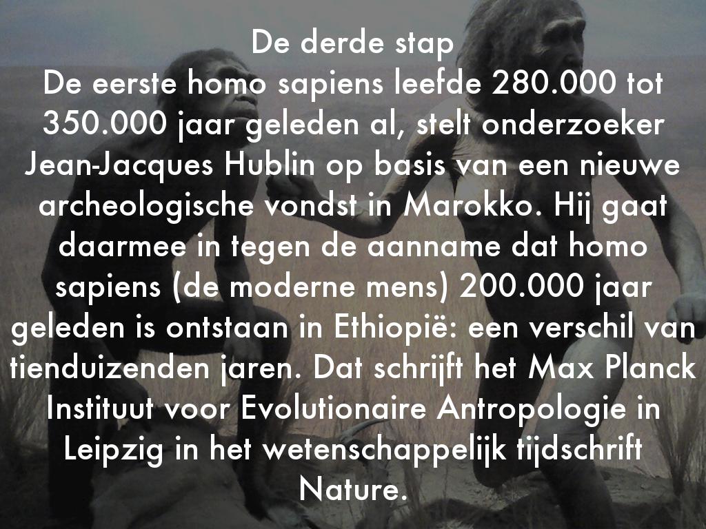 De eerste homo sapiens leefde 280.000 tot 350.000 jaar geleden al, stelt onderzoeker Jean-Jacques Hublin op basis van een nieuwe archeologische vondst in Marokko. Hij gaat daarmee in tegen de aanname dat homo sapiens (de moderne mens) 200.000 jaar geleden is ontstaan in Ethiopië: een verschil van tienduizenden jaren. Dat schrijft het Max Planck Instituut voor Evolutionaire Antropologie in Leipzig in het wetenschappelijk tijdschrift Nature.
