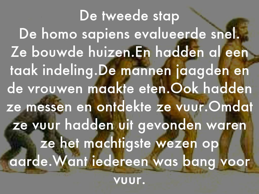 Ze bouwde huizen.En hadden al een taak indeling.De mannen jaagden en de vrouwen maakte eten.Ook hadden ze messen en ontdekte ze vuur.Omdat ze vuur hadden uit gevonden waren ze het machtigste wezen op aarde.Want iedereen was bang voor vuur.