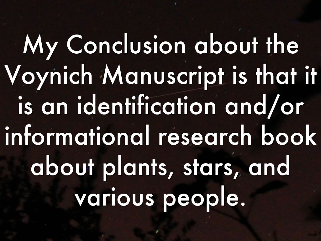 My Conclusion about the Voynich Manuscript is that it is an identification and/or informational research book about plants, stars, and various people.