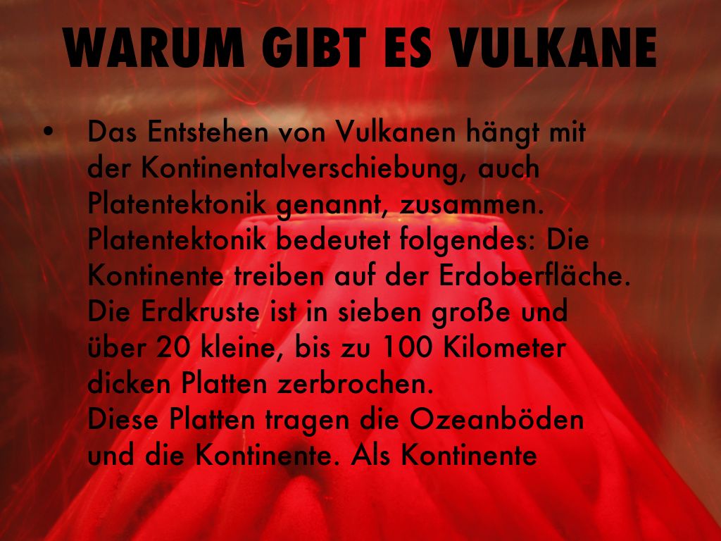• Das Entstehen von Vulkanen hängt mit der Kontinentalverschiebung, auch Platentektonik genannt, zusammen. Platentektonik bedeutet folgendes: Die Kontinente treiben auf der Erdoberfläche. Die Erdkruste ist in sieben große und über 20 kleine, bis zu 100 Kilometer dicken Platten zerbrochen. Diese Platten tragen die Ozeanböden und die Kontinente. Als Kontinente bezeichnen wir die etwas erhöhten Teile dieser Platten, die aus dem Meeresspiegel herausragen. Die Platten treiben vom glutflüssigen Erdinneren angetrieben mit nur wenigen Zentimetern im Jahr in verschiedenen Richtungen dahin. An machen Stellen schieben sich die Platten untereinander, an anderen Stellen werden die Platten als Ausgleich auseinander gezogen. Dadurch können Spalten entstehen, aus denen glutflüssiges Magma aus dem Erdinneren aufsteigt. Aber besonders in den Gebieten, wo sich die Platten ruckartig und unter extremen Druck untereinander schieben, wird Magma nach oben gedrückt und es entstehen Vulkane. Daher findet man die meisten Vulkane entlang der Ränder der Kontinentalplatten, die dort ganze Vulkanketten bilden.