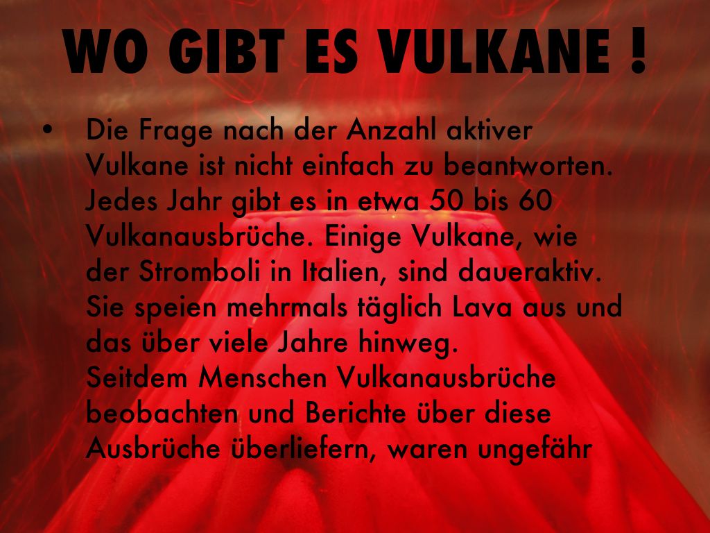 • Die Frage nach der Anzahl aktiver Vulkane ist nicht einfach zu beantworten. Jedes Jahr gibt es in etwa 50 bis 60 Vulkanausbrüche. Einige Vulkane, wie der Stromboli in Italien, sind daueraktiv. Sie speien mehrmals täglich Lava aus und das über viele Jahre hinweg. Seitdem Menschen Vulkanausbrüche beobachten und Berichte über diese Ausbrüche überliefern, waren ungefähr 600 verschiedene Vulkane aktiv. Allerdings wurden sehr wahrscheinlich nicht alle Vulkanausbrüche beobachtet, weil viele Vulkane in unbewohnten Gegenden liegen, so dass keine Menschen da waren, die diese Ausbrüche beobachten konnten. So gab es in historischer Zeit vermutlich 1000 aktive Vulkane. In den letzten 10.000 Jahren waren mehr als 1900 Vulkane aktiv. Fördert ein Vulkan in einem Zeitraum von 10.000 Jahren keine Lava mehr, so gilt er als erloschener Vulkan. Trotzdem kommt es immer wieder vor, dass auch Vulkane die für erloschen gehalten wurden, wieder ausbrechen.