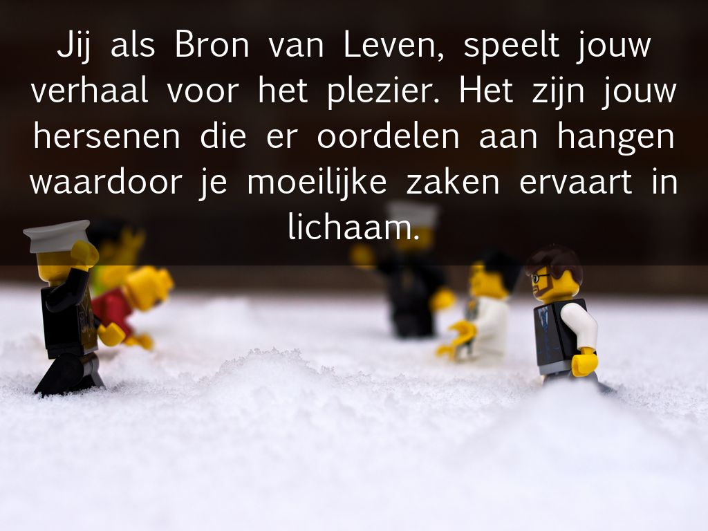 Jij als Bron van Leven, speelt jouw verhaal voor het plezier. Het zijn jouw hersenen die er oordelen aan hangen waardoor je moeilijke zaken ervaart in lichaam.